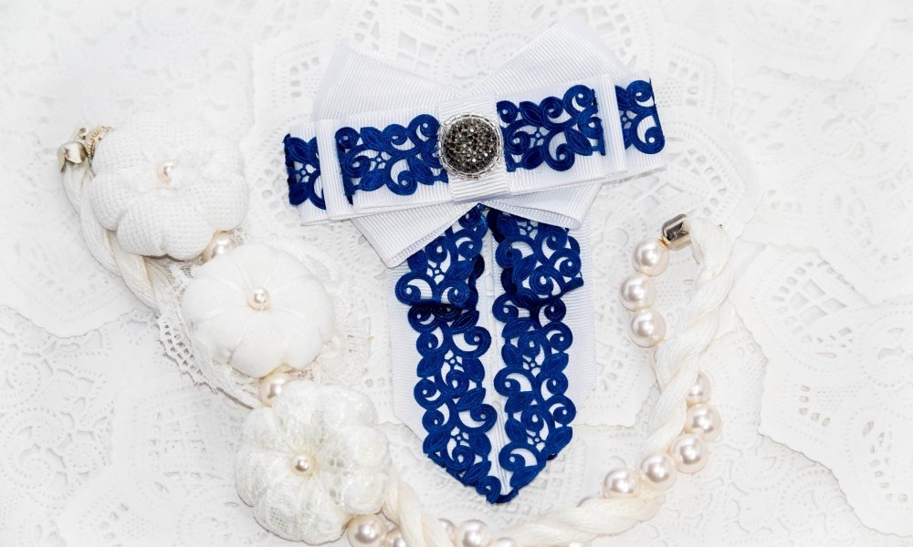 Материал: репсовая лента синего ибелого цвета + хлопковое кружево белого цвета